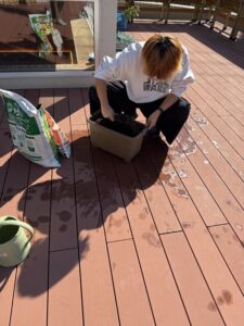 ポカポカのテラスにダンボールを持ち出し、切り始めました。
