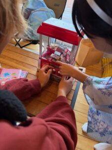 ポップコーンマシーンは、思っていたよりも、ポンポンと弾けて「うわぁ。あついポップコーンがおそってきそう!」と大興奮。
