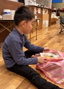 プレゼントが置いてあることに気がついた子どもたちは、わくわくしながら包みを開けていました。